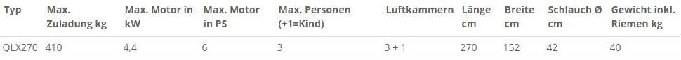 Das Talamex Aqualine QLX mit Aluminiumboden ist mit einem aufblasbarem Kiel ausgerüstet. Der Kiel sorgt für den tiefen V-Boden, der dem Boot seine perfekten Fahr- und Rudereigenschaften gibt. Der Aufbau des Aluminiumbodens erfordert zwar etwas mehr Zeit, dafür gibt der Aluminiumboden dem Boot aber große Festigkeit und Stabilität und ist nahezu wartungsfrei. Das QLX Boot ist sehr gut geeignet für Davits und als Freizeitboot.