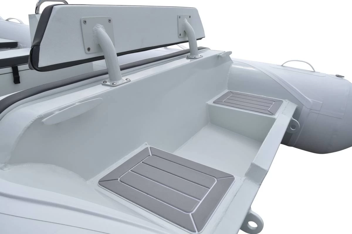 Luxus RIBs mit selbstlenzendem Cockpit, Luxus Konsole mit seitlichem Sitz, Bugankerplatte, Bugkissen, Boden mit Teak-Design, Badeleiter